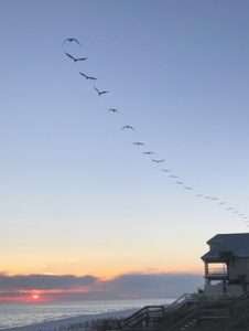 Without warning and totally silent an endless parade of pelicans glided past. I had time to find my iPhone, open the camera and snap several shots as these graceful creatures with their wings set and rode the updraft off the bay in perfect formation.