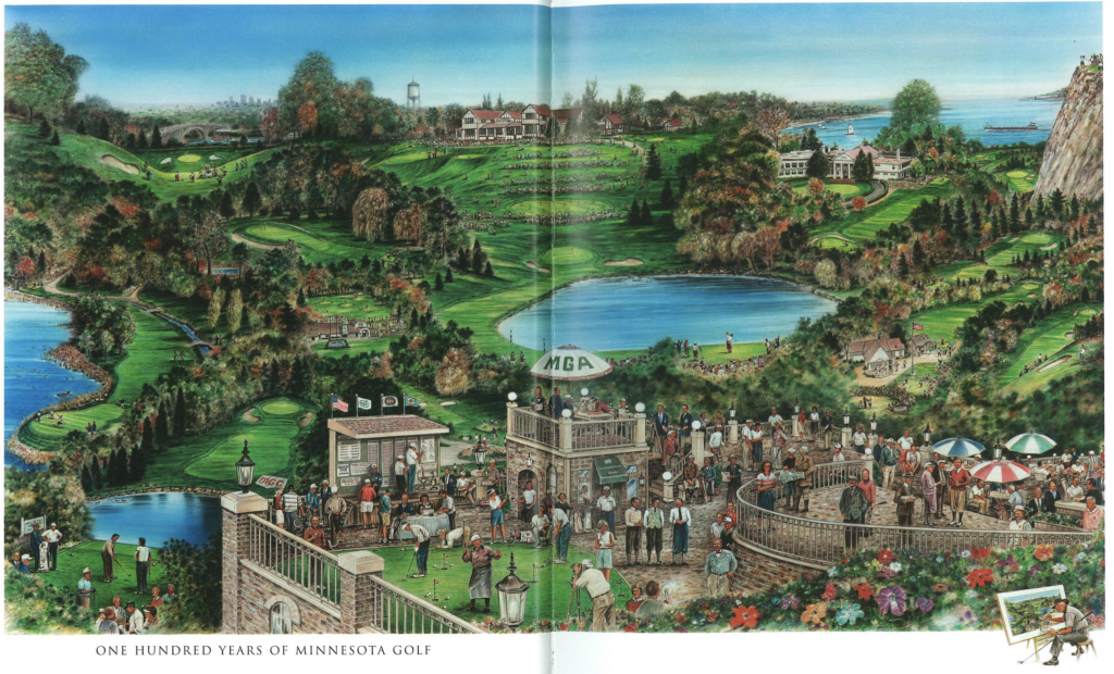 Another less well known Chapman painting is the one Bud did for the 100th anniversary of MN Golf. The painting features a caricature many of the golfers who created Minnesota Golf History.