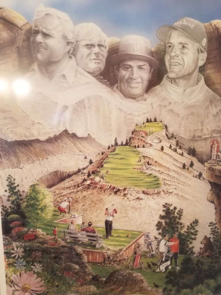We will finish off our tribute to Bud Chapman with a painting of his good friend, Johnny Snyder. Snyder was one of the best to ever prowl the public courses in the Twin Cities. He had a great record in MN Public Links Championships. Johnny also has a record that is unmatched on the Dakota Tour (Mini Tour) where for several years he seemed to win every event. Snyder played in two US Open Championships and was fully exempt on the PGA Tour in 1986. Snyder won the Minnesota State Open in 1997. The Mt Rushmore painting of Snyder among three golfing greats was done by Chapman after Snyder won the 1986 Minnesota Golf Champions Tournament. Johnny pointed out that Chapman included his longtime caddie, Chico, in the painting. Chico is holding Snyder’s bag, lower right corner.