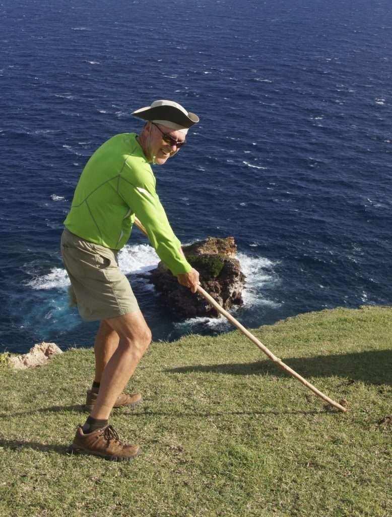 On our second day on the most peaceful place on earth, we planned a hike along the Old Sulfur Mine Trail overlooking the sea. As we broke out of the rain forest onto a meadow like clearing, I was stunned – I thought we had discovered a lost golf course on Saba! The goats, in a rainbow of sizes and colors, had nibbled the turf on this approximately 2-acre site to a play-the-ball-down height. With the wind whistling and the surf pounding 400 feet below, I thought of the shepherds who, while tending their sheep, invented the game we love to hate. As I stepped closer to the cliff overlooking the ocean, there below me was Green Island, the same small grass covered island that serves as a target for pilots landing on Saba, bobbing like that fishing bobber below me.