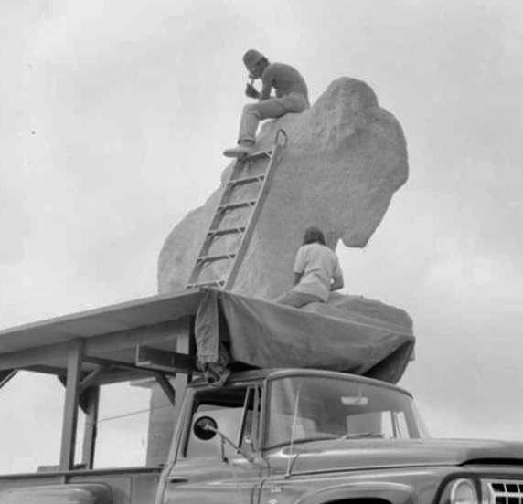 Armed with only a small replica model, a steel chisel and a two pound maul, Fritz worked tirelessly to uncover the magnificent beast that only he saw hidden within the chalky stone. We marveled as he would mindlessly place the chisel with his left hand and strike five evenly timed blows with his right hand. Subconsciously, he would switch hands, chisel in the right, maul in left. With the same rhythm, but a slightly different tone, he strike five blows with the left. The sound of steel on steel could be heard for hundreds of yards across the golf course as chips of stone fell silently to the ground. When the transformation was complete the silence on the golf course was deafening.
