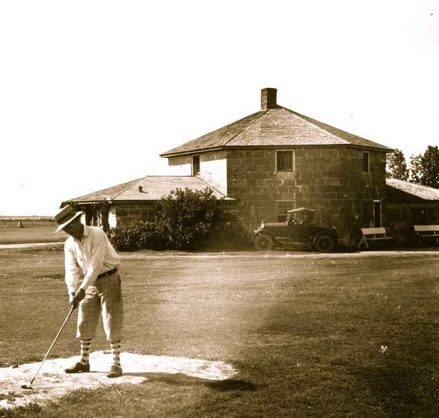 I first became aware of the huge gallery, in reality maybe 75-100 people, who had gathered two or three deep behind the hill-top third green. The hexagon shaped lime stone clubhouse, that once served as the administrative headquarters for Fort Hays, was near.