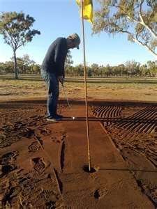 Sand greens were made from sifted sand that had been mixed with oil to create a substance that had the consistence of wet sand. The oily sand did not dry out or blow away. A smooth putting path was created for each golfer to putt on with a heavy metal rake or drag. The drag section of the rake was a four foot length of 2 inch pipe with half inch welded teeth spaced evenly on one side. The other side of the drag was smooth and flat. The drag section was attached to a smaller diameter pipe handle about five feet long. To create a putting path a golfers would pull the drag, teeth down making groves, away from the hole to the approximate area of his ball. (exact position was not important because sand greens were basically flat). The drag would be turned smooth side down and pulled back along the line the teeth created about three feet beyond the hole. The heavy drag packed the oily sand into a remarkably smooth and true putting surface. A large metal spoon was available on each green to remove the sand from of the hole after dragging. When all golfers had putted out and the flag stick replaced the putting paths would be erased by dragging the rake, teeth side down, in an expanding circle starting at the hole, until all path marks were smoothed with roughed groves. The golfer who putted first, longest putt, was required to drag the green. If there was a caddie in the group, he would drag all greens for a nickel or dime from each player.