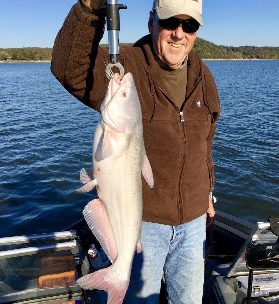 We were fishin’ this splendid fall day for catfish, Blue Cat to be specific.  The Blue Cat is a genetic relative to the Bullhead, but that is where the comparison stops.  Blues, as they are affectionately know, prefer clean water and feed almost exclusively on live shad.  Fish lovers crave the sweet taste and firm flesh of fried Blue Cat filets. The preferred eating size for Blues is 3 to 8 pounds, but it is not unusual to catch them in the 15 to 30 pound range some much larger.